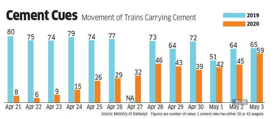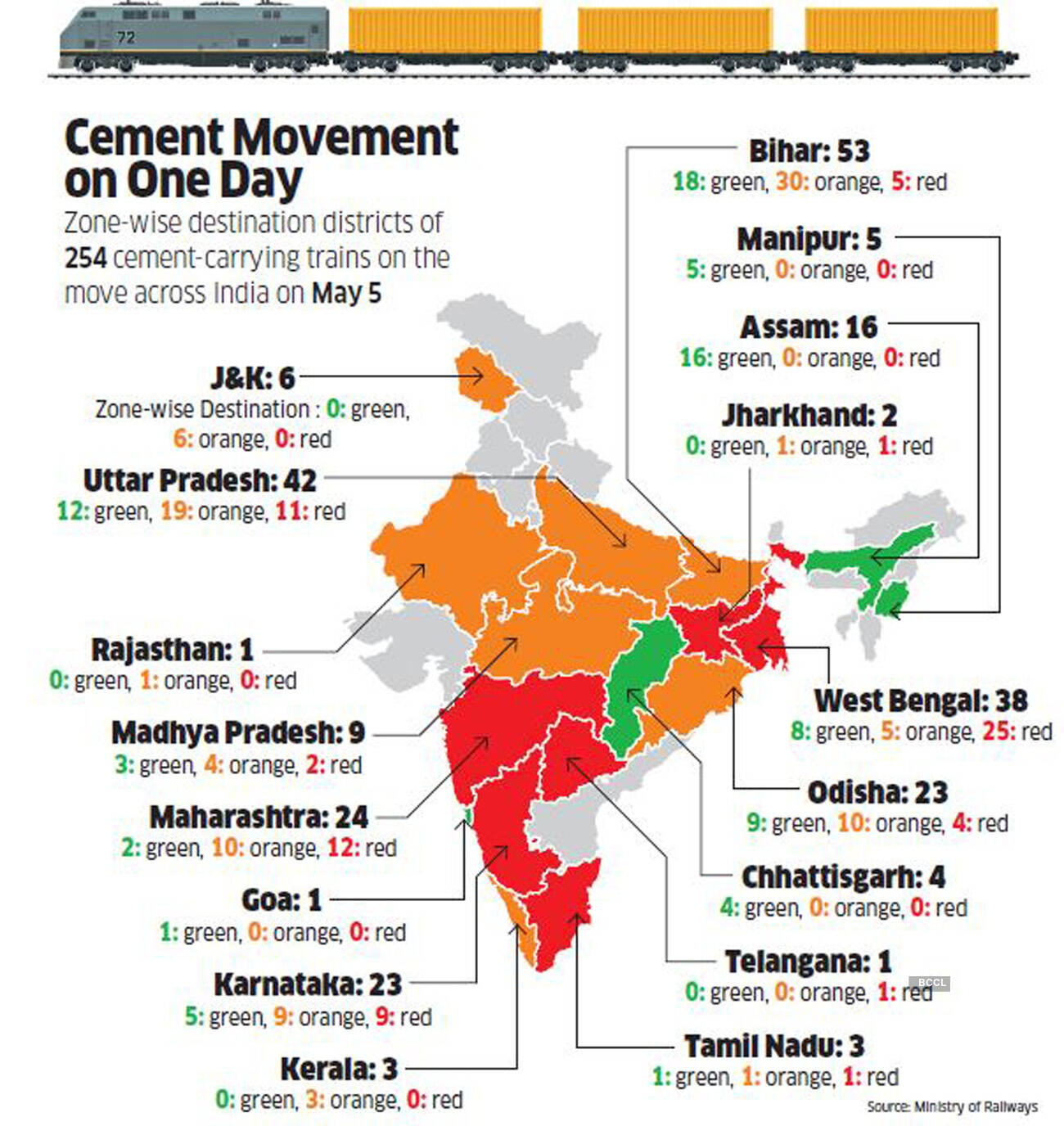 The railway data, previewed by ET Magazine, shows that 254 trains carrying cement were on the move on May 5 when Lockdown 3.0 began: 84 of them were travelling towards green zones, 99 to orange and only 71 to red.