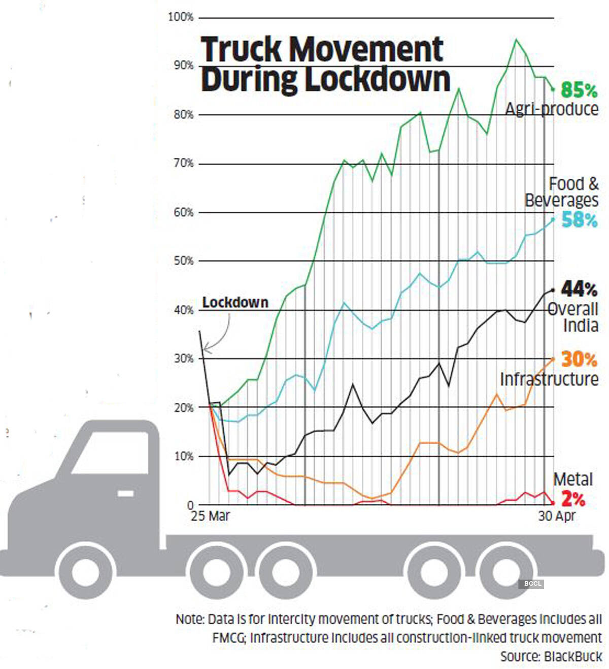 In this pervasive gloom, some indicators offer flickers of hope. Bengaluru-based trucking platform BlackBuck has seen a spike in bookings on the back of a good harvest. The agri pickup is likely to continue into the kharif season, with the India Meteorological Department forecasting a good monsoon. Cofounder Rajesh Yabaji says: “We have seen 80,000 bookings since we opened up our commission-free platform in April-end. Now, we estimate truck traffic to be at 50% of pre-lockdown trucking movement.”