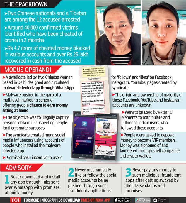 NEW DELHI: Twelve people, including two Chinese women and a Tibetan, were arrested by Cyber Cell of Delhi Police for duping people of crores by making them install apps of their marketing scheme, which had malware. These app users were then exploited to create social media influencers.