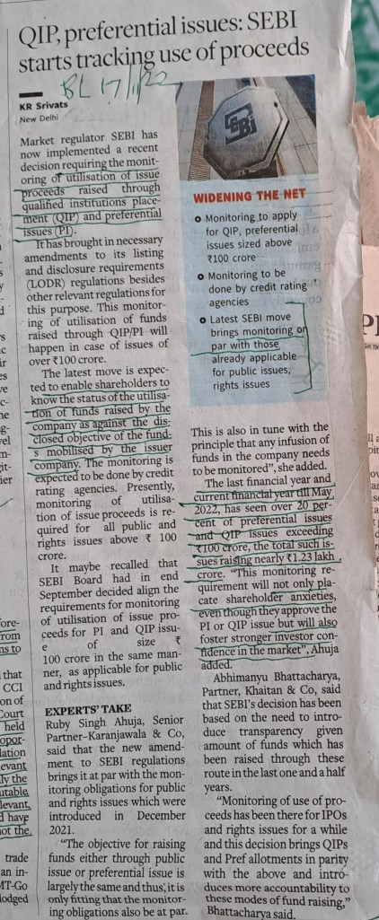 SEBI steps to increase monitoring use of funds garnered thru QIP and Preferential issues–Courtesy Business Standard