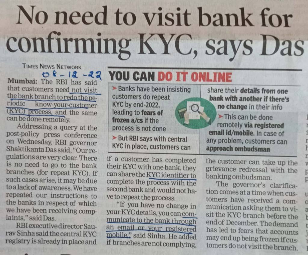 KYC can be shared on line method —Rider –only in respect of sharing of details from one bank to another bank — Courtesy Times of India