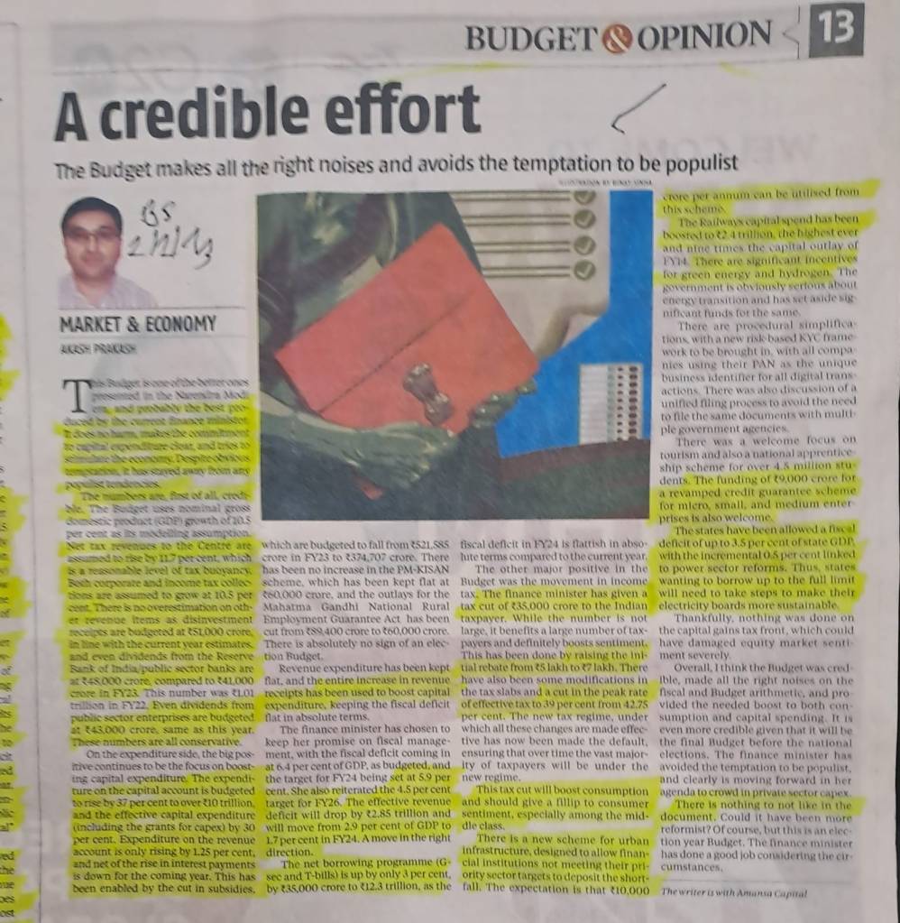 This article is all praise for the budget and says it is the best produced by the Finance Minister. [2] in the last para it says ” there is nothing to not like in the document ” Courtesy BS