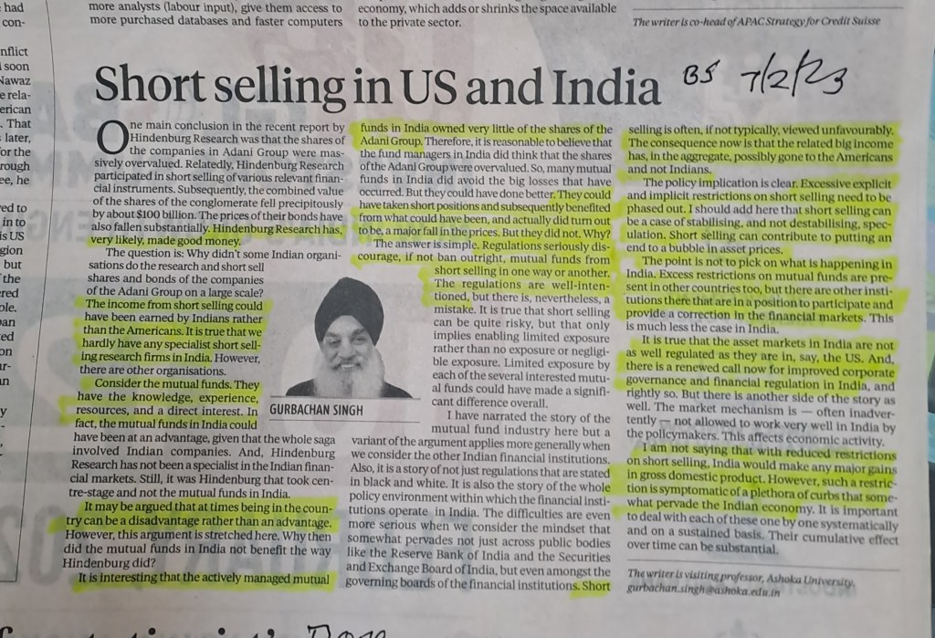 The article refers to advantages of short selling vis a vis regulatory restrictions in India with focus on mutual funds Courtesy BS