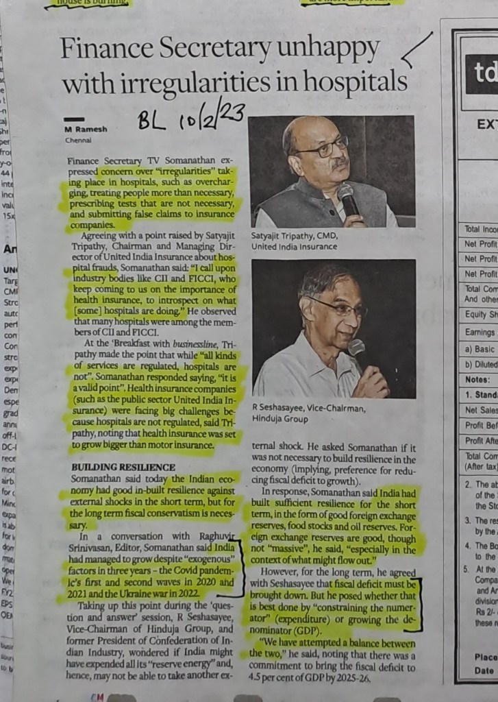 ЁЯЩПЁЯЩПЁЯЩПFinance Secretary unhappy with hospitals–Courtesy BusinessLine 10.2.2023