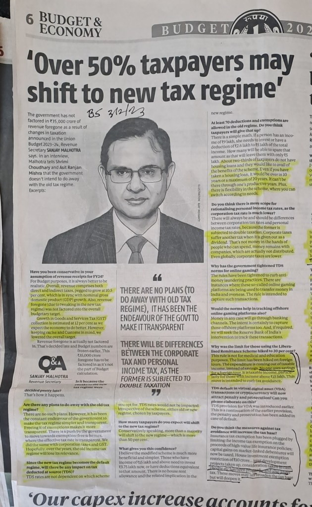 ЁЯЩПЁЯЩПЁЯЩП*New Regime 50% r expected to shift– Courtesy Business Standard 3.2.23