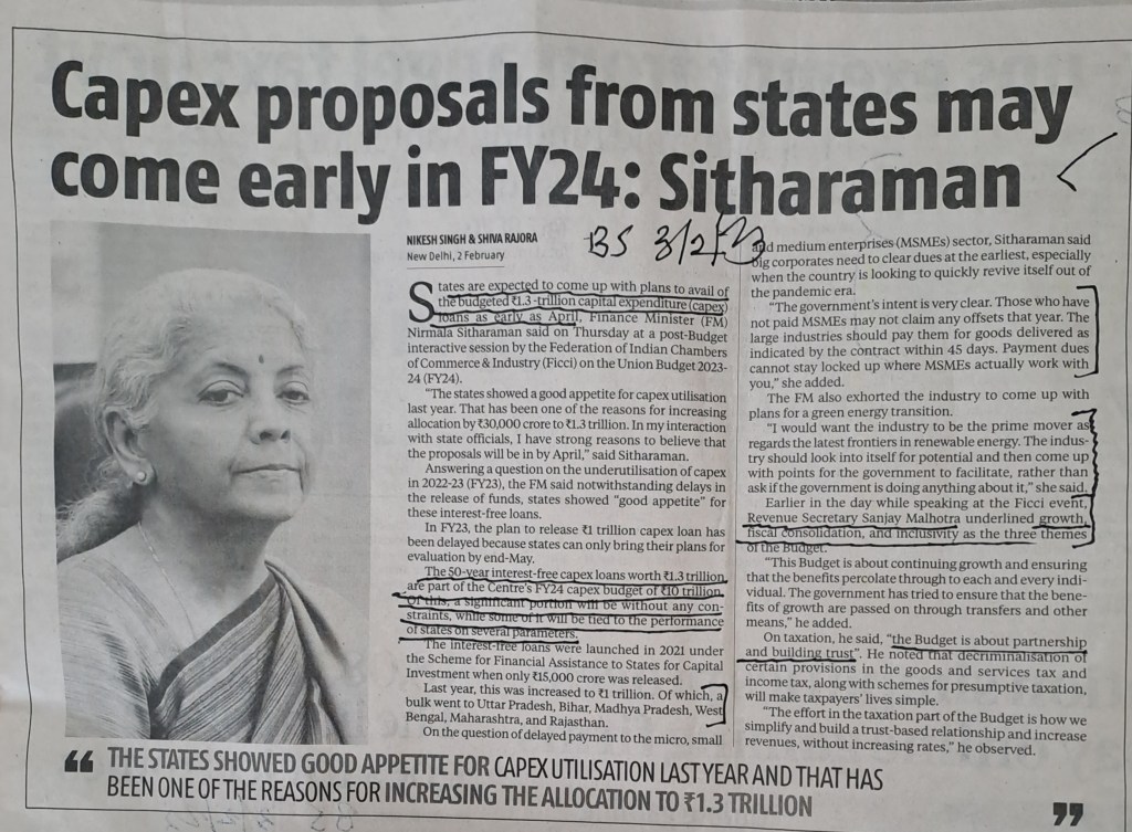 Central Government to ensure capex proposals come from States almost at the start of the year–Courtesy Business Standard–3.2.23