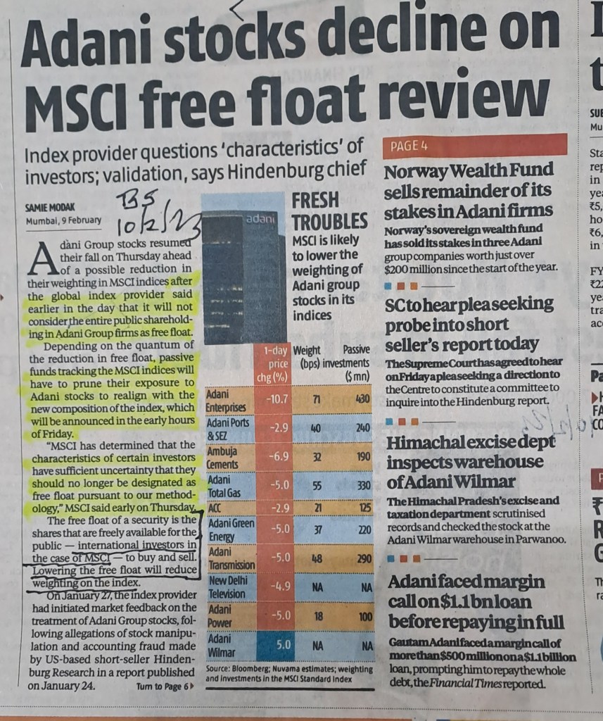 How MSCI free float affects Adani? Courtesy Business Standard 10.02.23