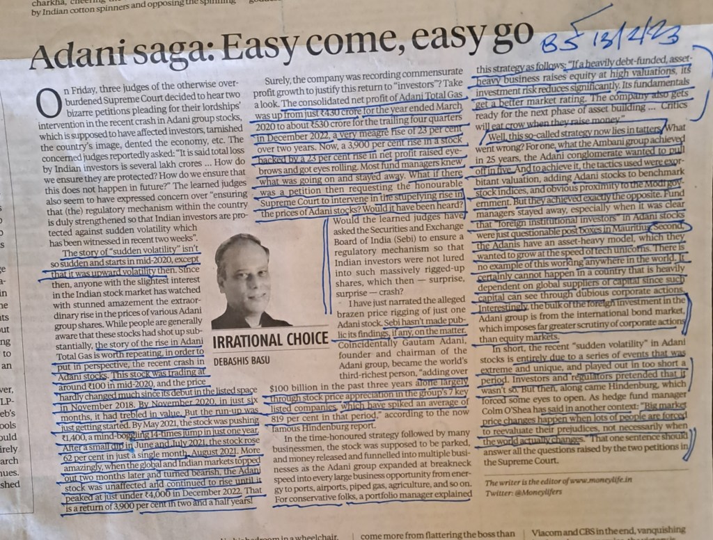 Article points out –nobody complained when prices went up very fast and now there is hue and cry if the prices r falling– Courtesy Business Standard 13.2.23