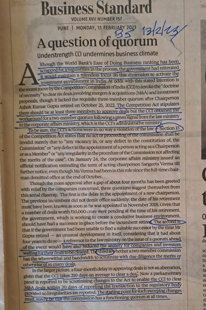 Competition Commission of India– question of quoram? Courtesy Business Standard 13.2.23