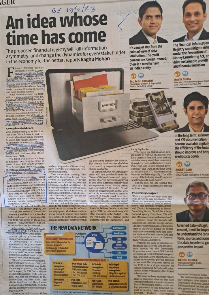 Financial Registry–A revolution in the making– Courtesy Business Standard 13.2.23