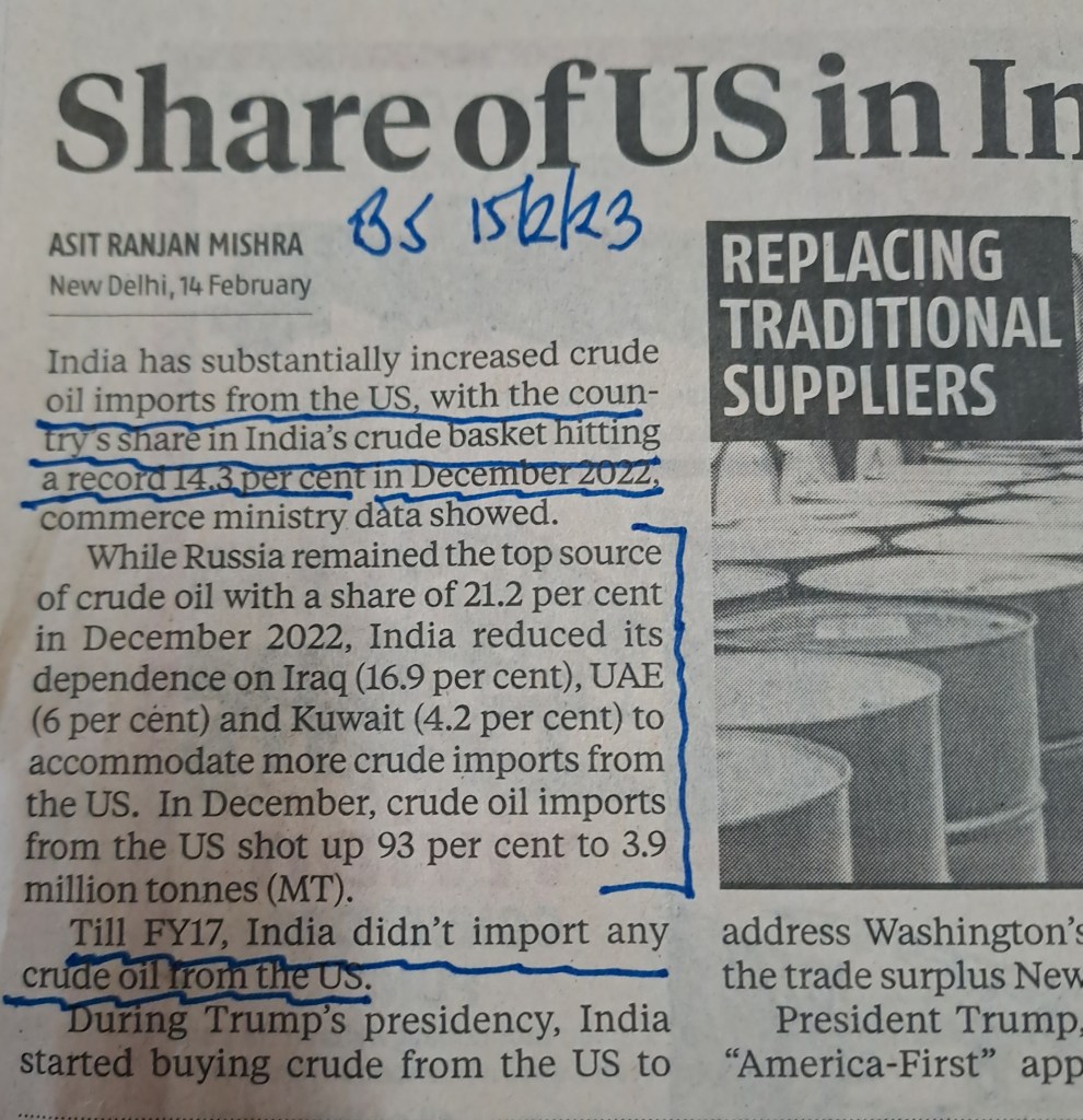 India buys crude from Russia and US–replacing traditional suppliers– Courtesy Business Standard 15.2.23