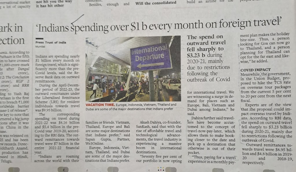 ЁЯЩПForeign travel by Indians increase –monthly average spends on recent times is 1 billion dollars–Courtesy BusinessLine 22.2.23