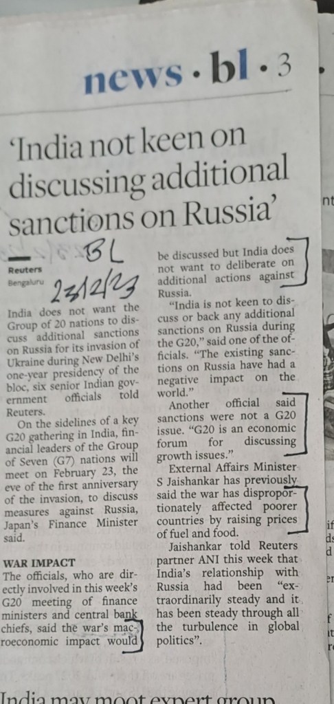 ЁЯЩПIndia averse to discussing additional sanctions against Russia –BusinessLine–23.2.23