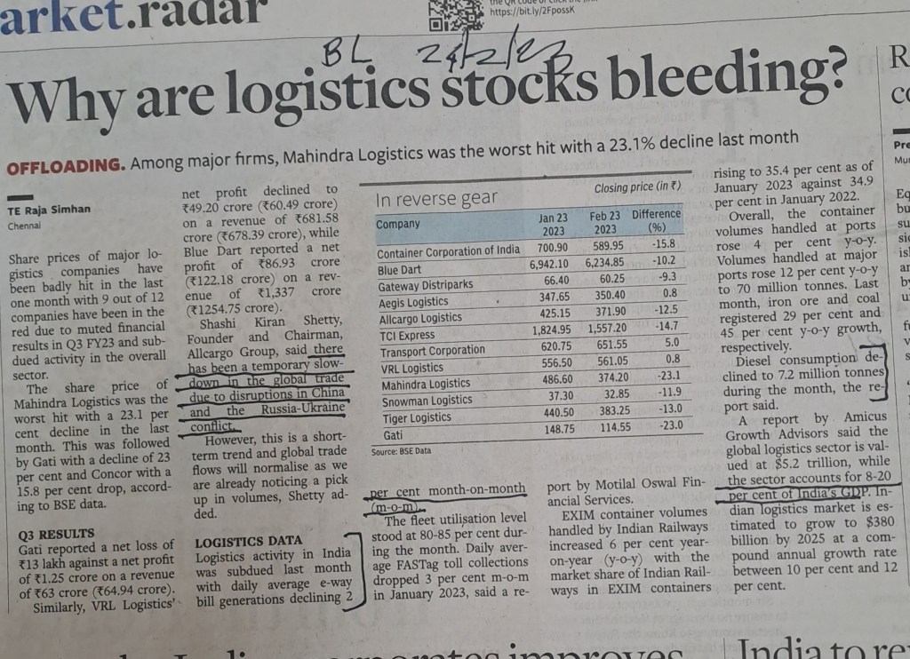 ЁЯЩПAnalysis of Logistics stocks getting a hit –Courtesy BusinessLine 24.2.23