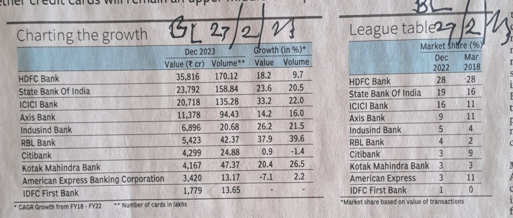 ЁЯСНCredit Card data –worth having a peep into –Courtesy BusinessLine 27.2.23
