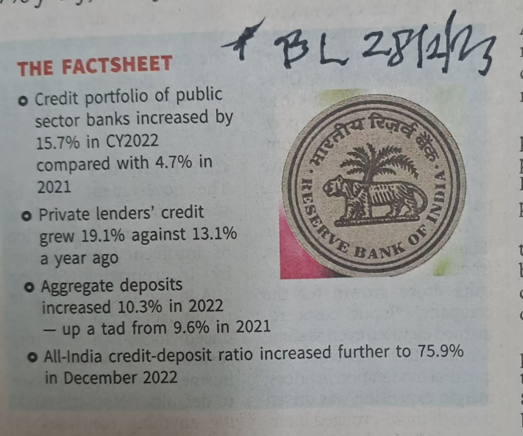 ЁЯЩПCredit expansion vis a vis deposit growth–Courtesy BusinessLine 28.2.23