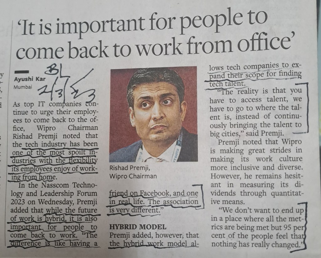 ЁЯЩПWork from Home–what Wipro Chief suggests? — Courtesy BusinessLine 2.3.23