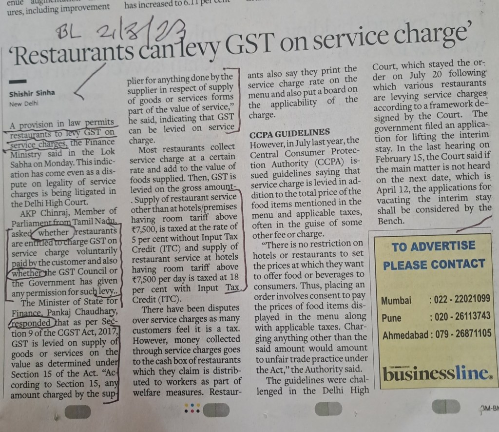 Government permits levy of GST on service charges voluntarily paid by customers — Courtesy BusinessLine 21.3.23