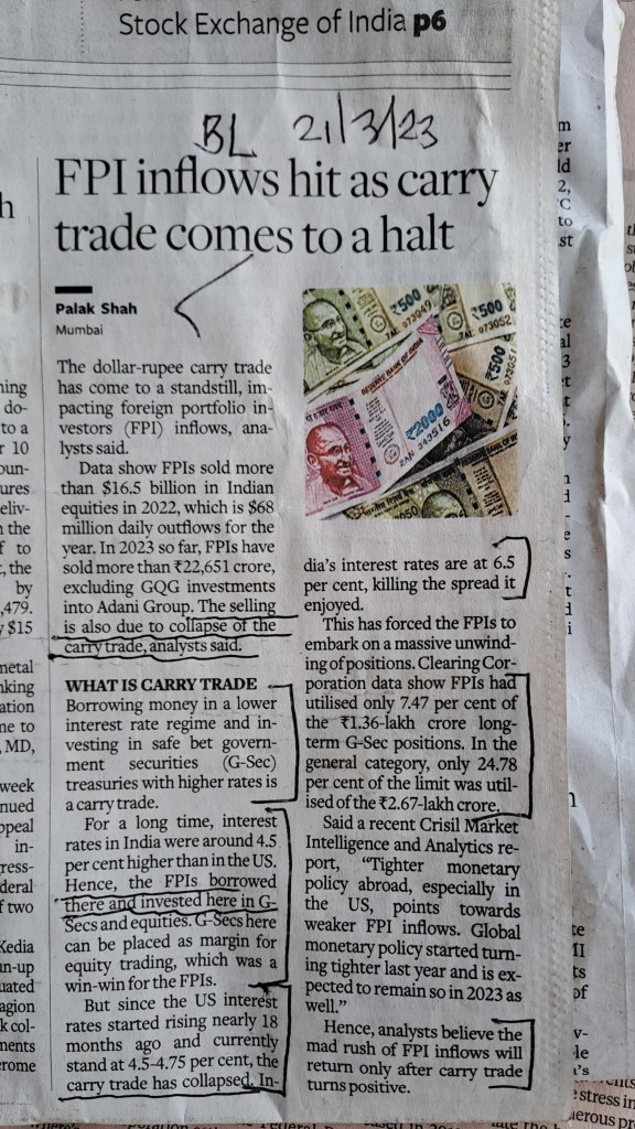 Effect of carry trade on FPI inflows–Courtesy BusinessLine 21.3.23