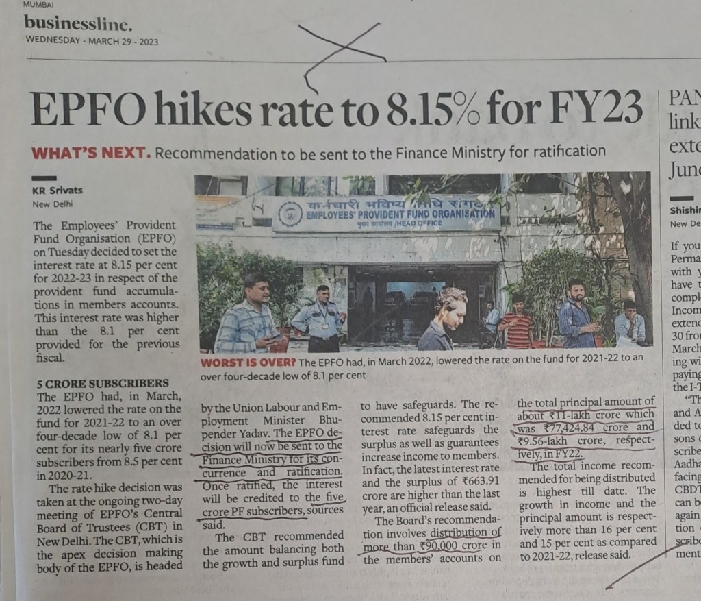 ЁЯЩПEPFO interest rate enhanced to 8.15% per annum –5 crores plus to benefit–total outstanding amount 11 lac crores –Courtesy BusinessLine 29.3.23