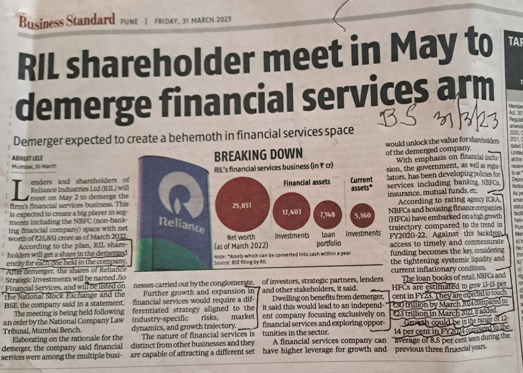 ЁЯЩПReliance planning to demerge financial services arm –Courtesy Business Standard 31.3.23