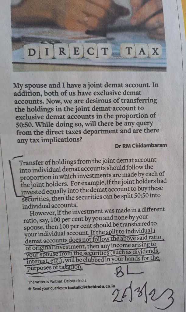 ЁЯЩПTax implications in cases of transfer from joint demat account –Courtesy BusinessLine 26.3.23