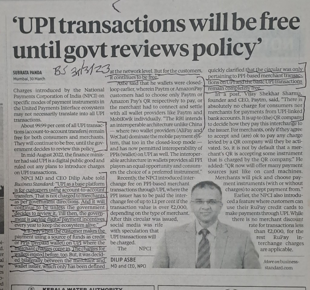 ЁЯЩПUPI transactions will be free until… Courtesy Business Standard 31.3.23