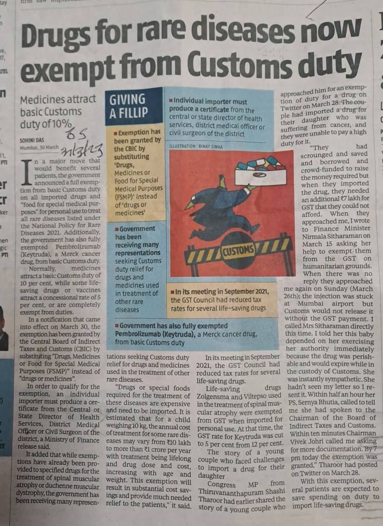 ЁЯЩПGovernment steps in to reduce custom duty to 10% — on drugs for rare diseases Courtesy Business Standard 31.3.23