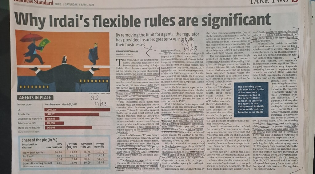 ЁЯЩПЁЯЩПЁЯЩПЁЯЩПЁЯЩПInsurance regulator IRDAI has removed the limit for payment of commission to agents –result the customers can bargain for a better quote –Applicable for both life and non life business — Courtesy Business Standard 1.4.23