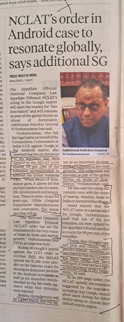 ЁЯЩПЁЯЩПЁЯЩПAdditional Solicitor General–who handled case against Google –feels the NCLAT judgement takes care of 98% of the remedies –Courtesy Business Standard 3.4.23