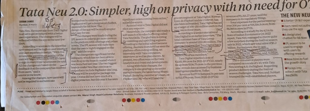 ЁЯЩПTata Neu app –a storm in the making –Courtesy Business Standard 2.4.23