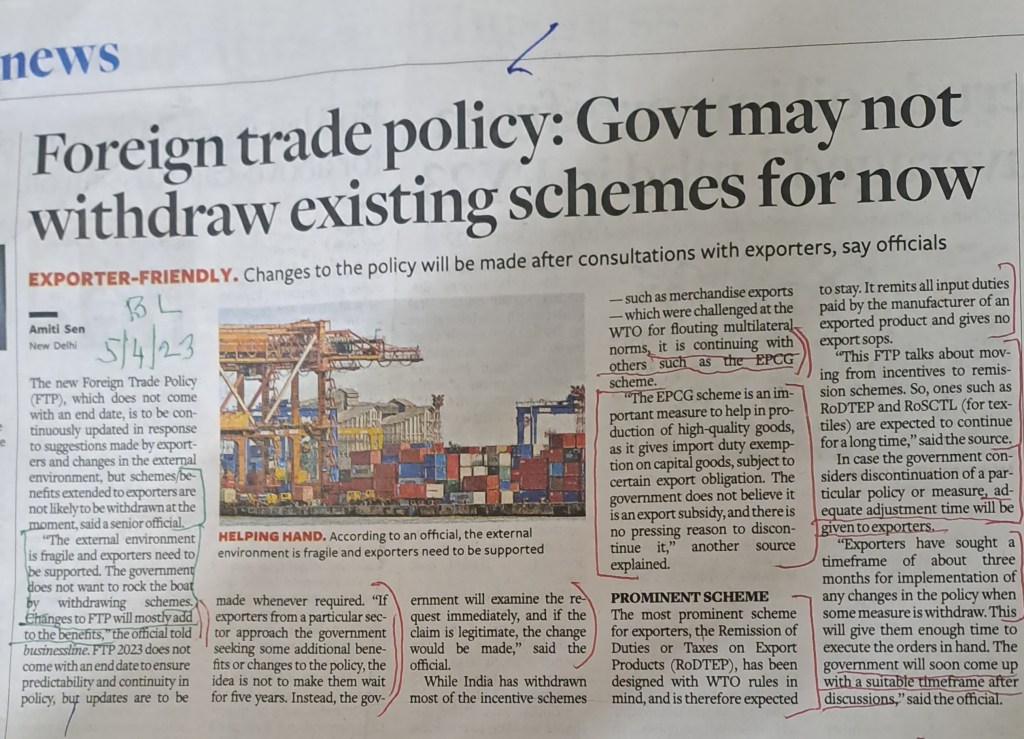 ЁЯЩПЁЯЩПЁЯЩПForeign Trade Policy–necessary care being taken by Government–Courtesy BusinessLine 5.4.23