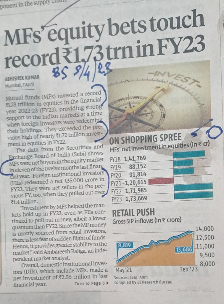 ЁЯЩПEquity investments by MF are at record 1.73 trillion in FY 23 — takes care of FPI exit– Courtesy Business Standard 8.4.23