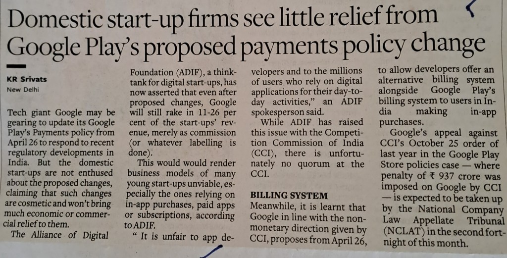 ЁЯЩПStartups — continue to face problems–may cough up 11% to 26% to Google even if playstore is not used —All eyes on CCI—Courtesy BusinessLine -April 23-