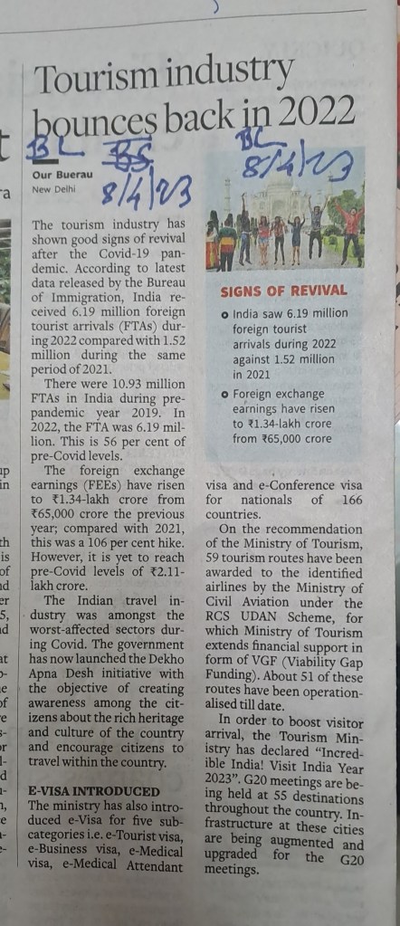 ЁЯЩПTourism Industry –jumps 4 Times in 22 as compared to 21 — Courtesy BusinessLine 8.4.23