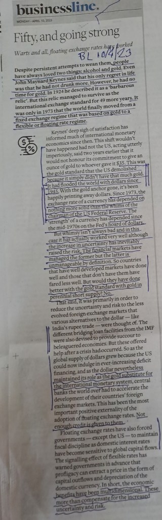 ЁЯЩПЁЯЩПЁЯЩПЁЯЩПЁЯЩПThe floating rate exchange is on since 1973 and though it is tilted in favour of dollar, the world had no other alternative as fixed exchange regime [ read linked to gold ] gave way to floating rate as US refused to give 35 dollars to an ounce of gold [3] the annexed article –Editorial in BusinessLine 10.4.23