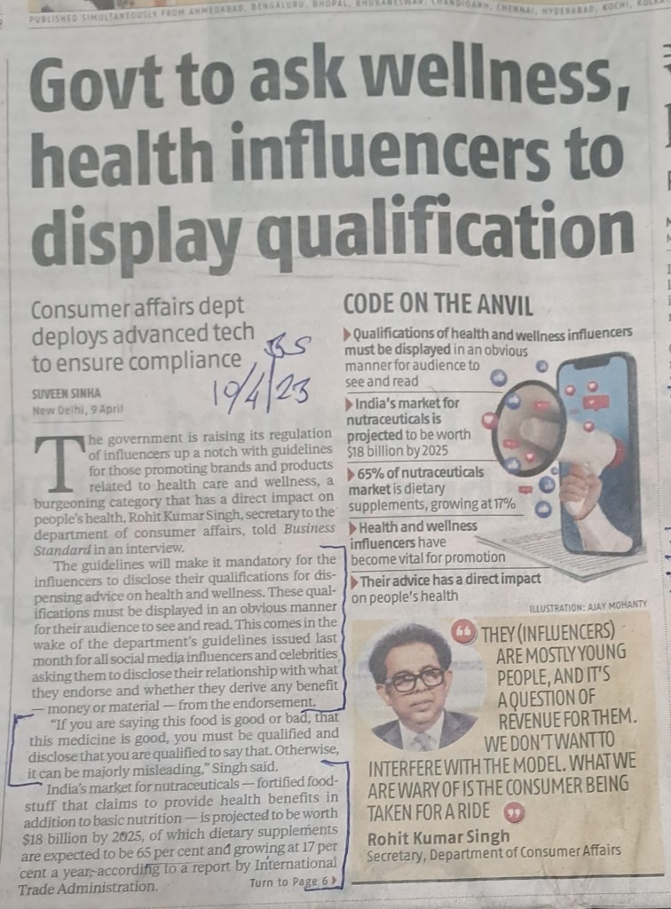ЁЯЩПWellness and health influencers need to display qualifications –Courtesy Business Standard–10.4.23