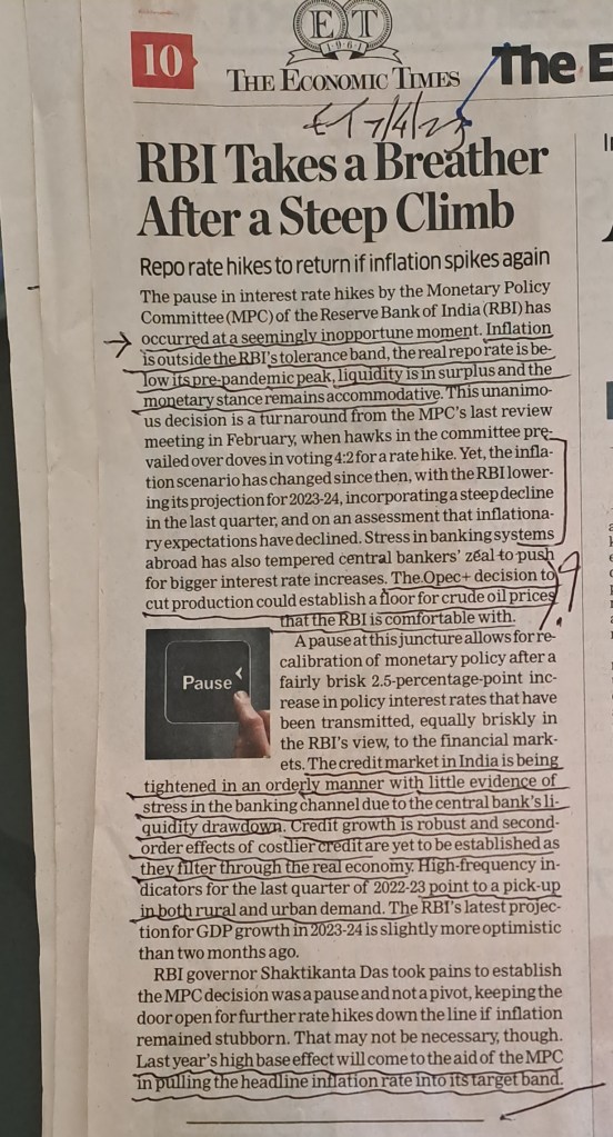 ЁЯЩПЁЯЩПЁЯЩПЁЯЩПЁЯЩПMPC — RBI takes a breather–is it justified? Courtesy Economic Times 7.4.23