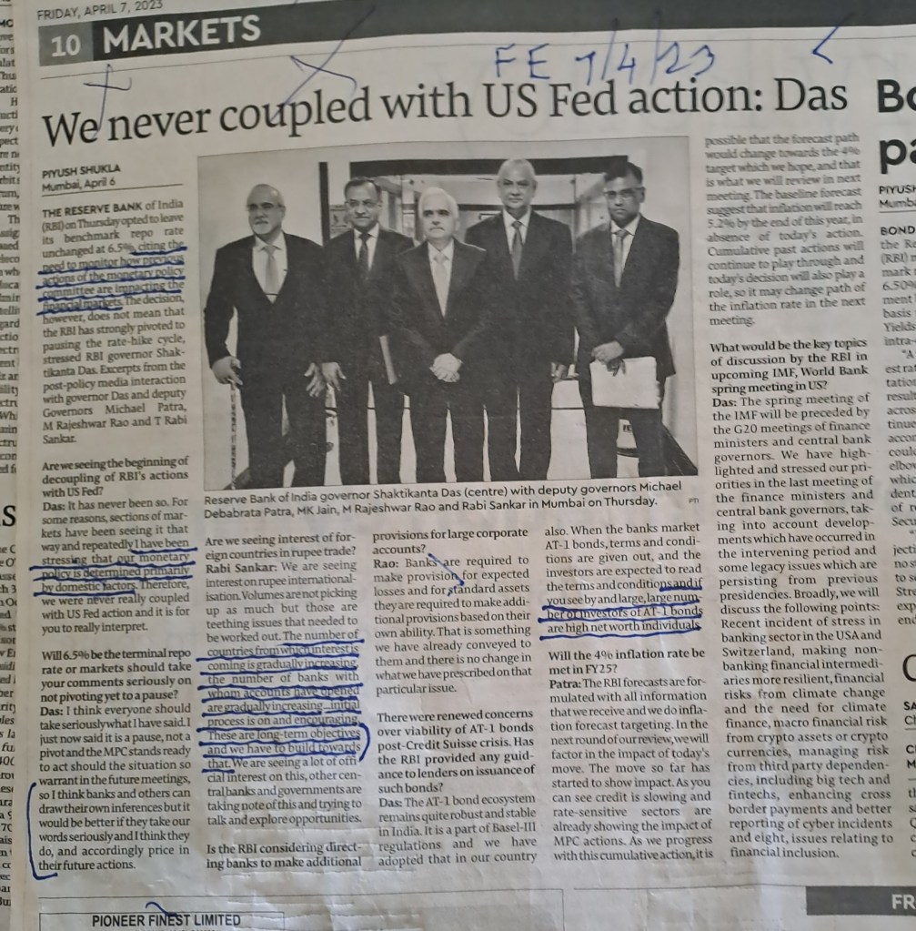 ЁЯЩПЁЯЩПЁЯЩПЁЯЩПЁЯЩПRBI Governor is emphatic–we never coupled with US Fed action –Courtesy Financial Express 7.4.23