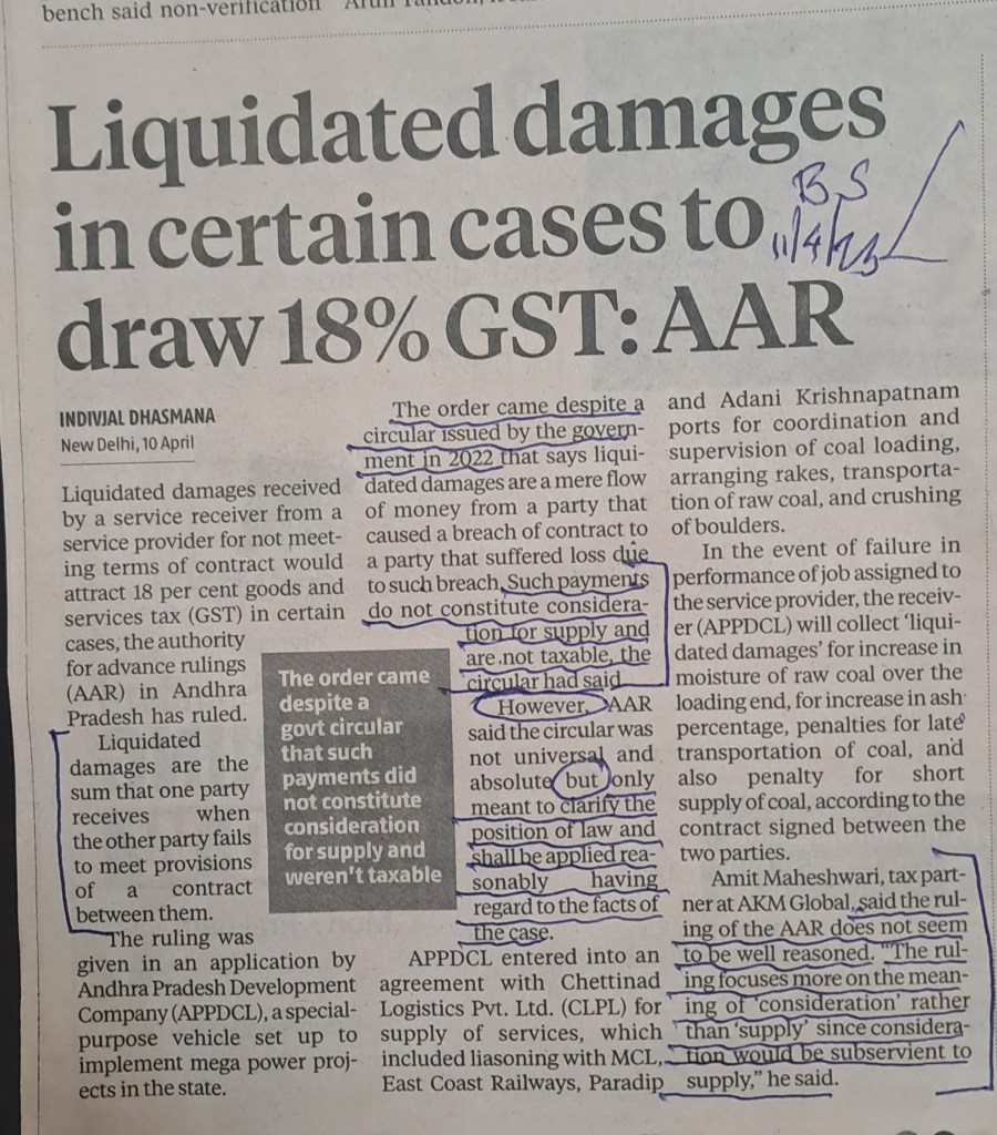 Liquidated damages to attract GST –in certain cases–ruling by Andhra Pradesh AAR — Courtesy Business Standard 11.4.23