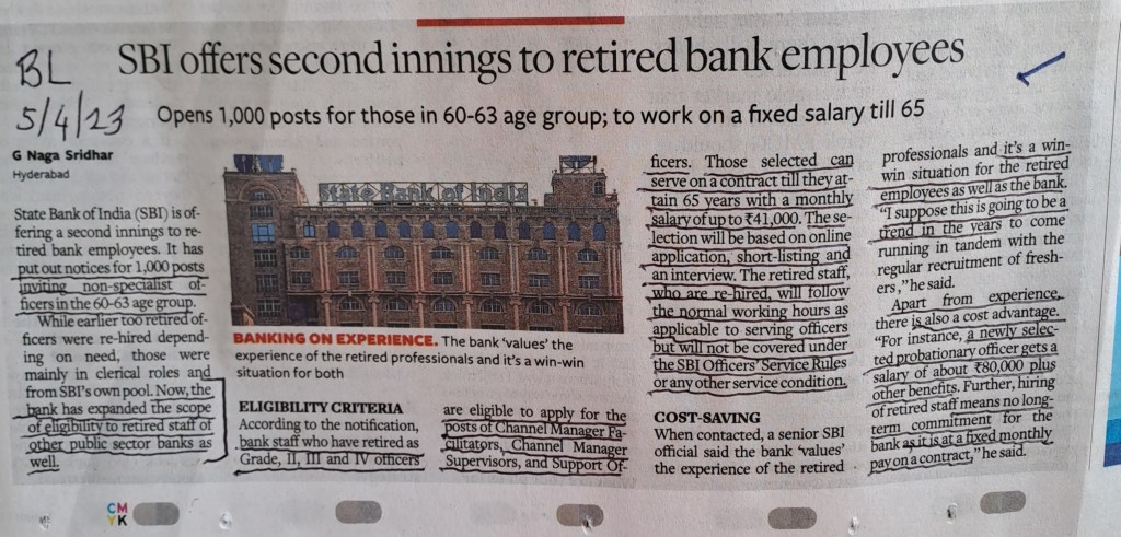ЁЯЩПUnique offer by SBI –for erstwhile retired executives–even non SBI are allowed to offer their services–Courtesy BusinessLine 5.4.23