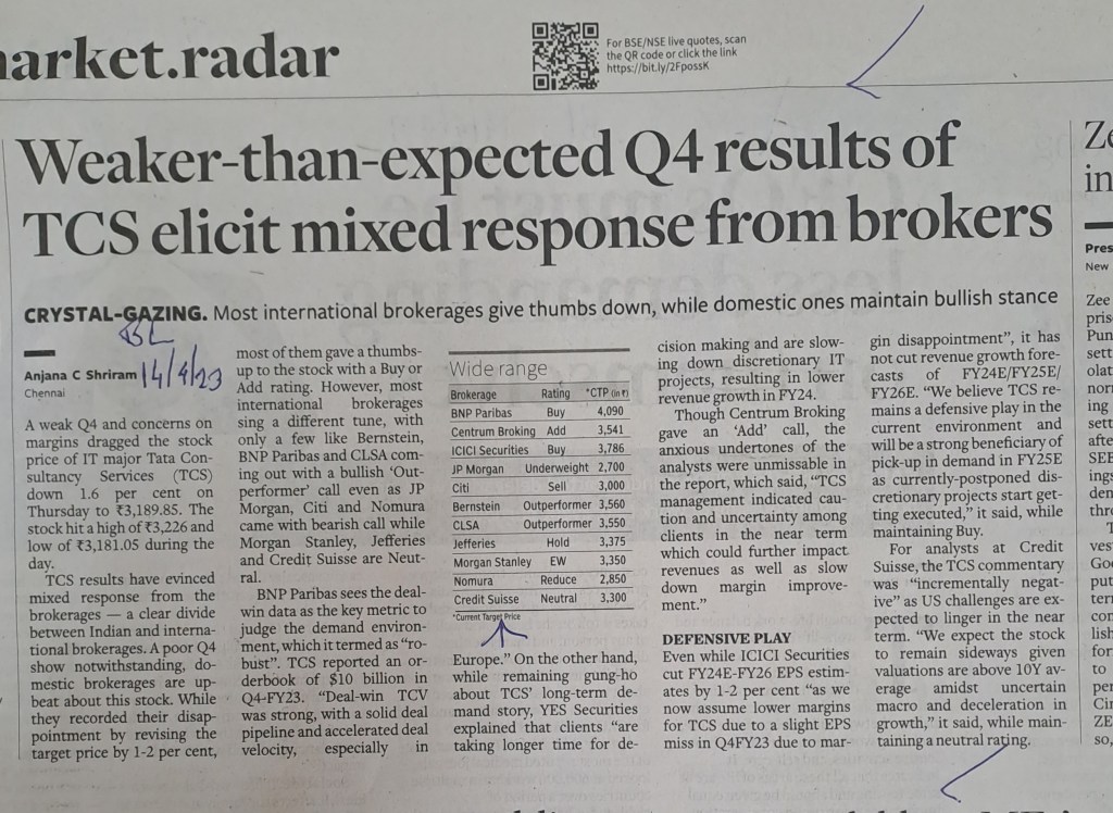 ЁЯСНЁЯСНЁЯСНЁЯСНЁЯСНTCS Q4 results — mixed response from brokerage houses — Courtesy BL–14.04.2023