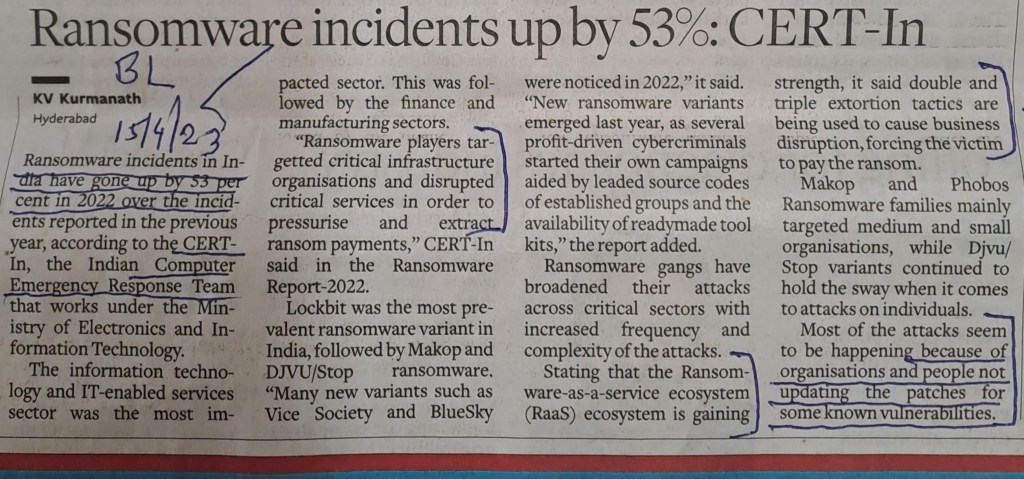 ЁЯЩПRisk posed by increased Ransomeware incidents–Courtesy BusinessLine 15.4.23