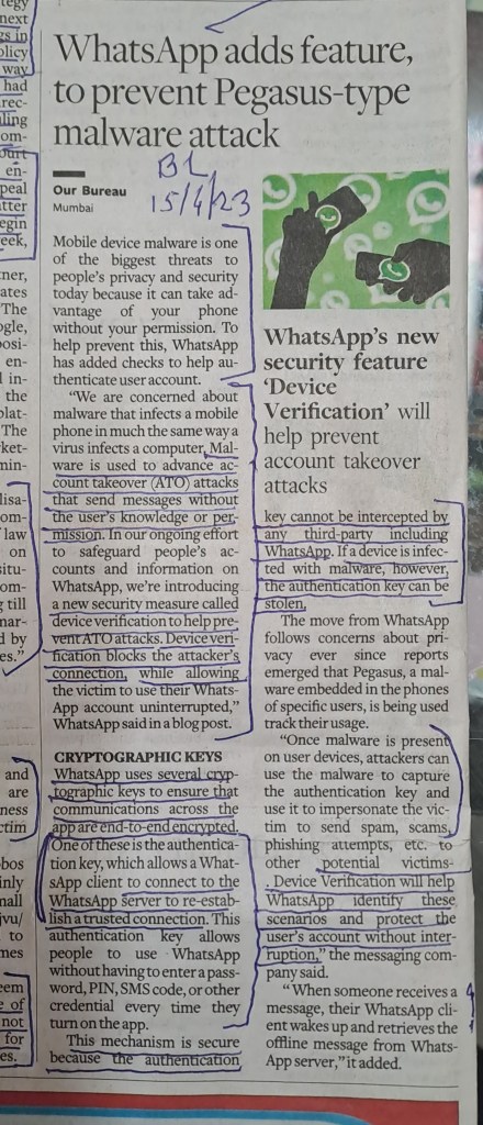 WhatsApp new security feature to prevent pegasus type attack –Courtesy BusinessLine 15.4.23