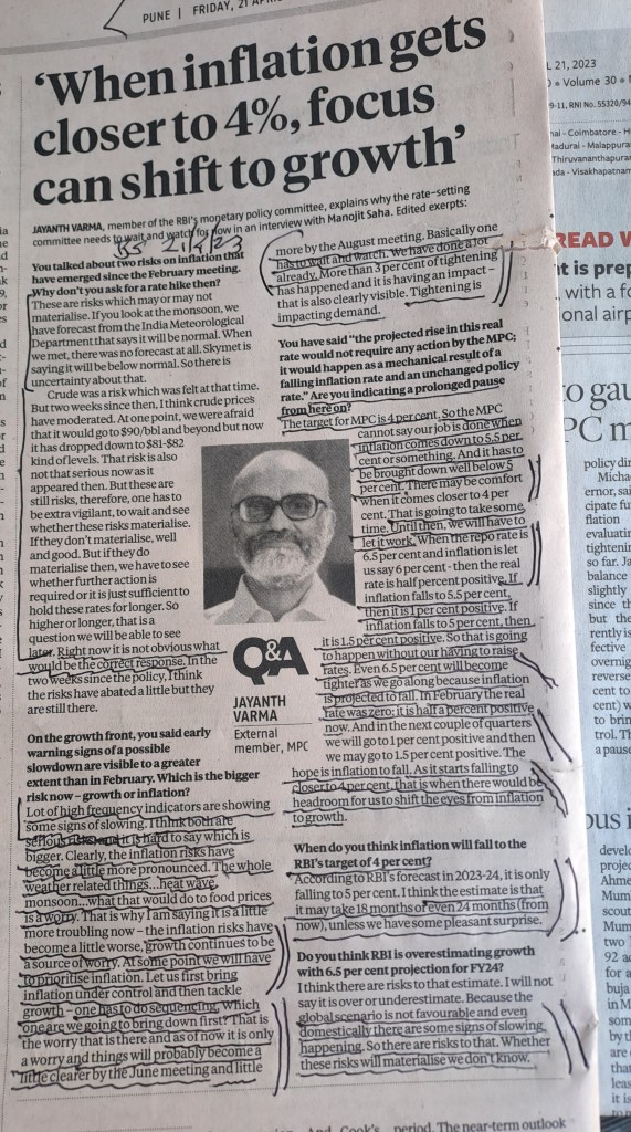 ЁЯЩПЁЯЩПЁЯЩПЁЯЩПЁЯЩПInflation vs growth –what the MPC member Mr Varma thinks–Courtesy Business Standard 21.4.23