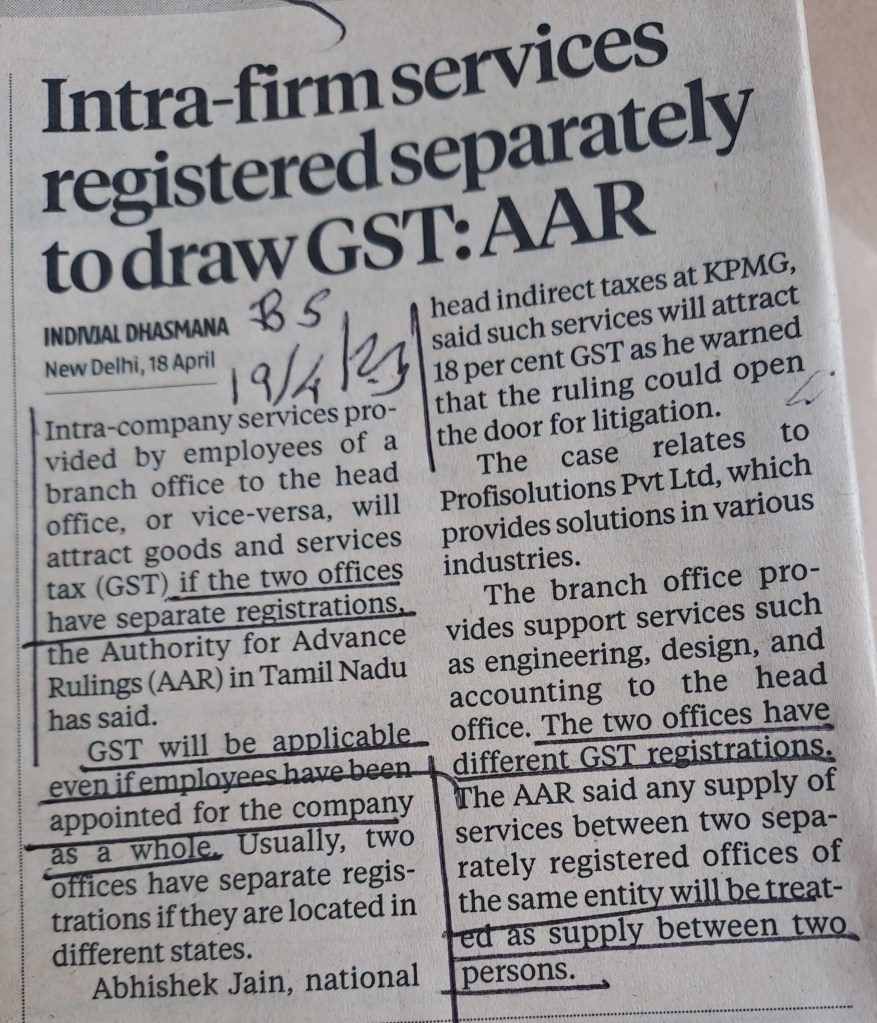 ЁЯЩПIntra-firm services –which are separately registered–attract GST –rules AAR — Courtesy Business Standard 19.4.23