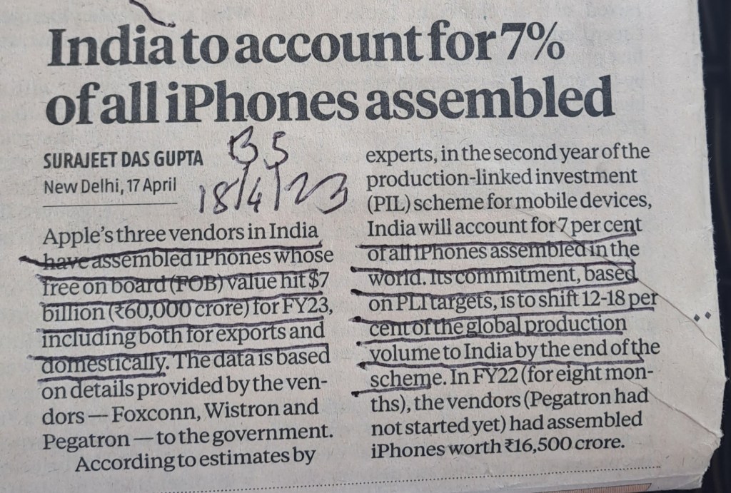 ЁЯЩПiPhone assembly in India likely to be 7% of total assembly–Courtesy Business Standard 18.4.23