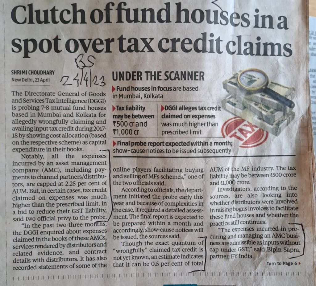 ЁЯЩПFund Houses under scanner for claiming undue tax credit claims–Courtesy Business Standard 24.4.23