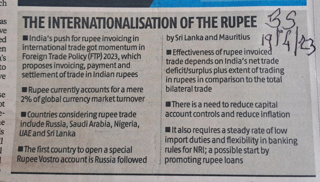 Internationalization of Rupee –the journey so far and the steps required going ahead –Courtesy Business Standard 19.4.23
