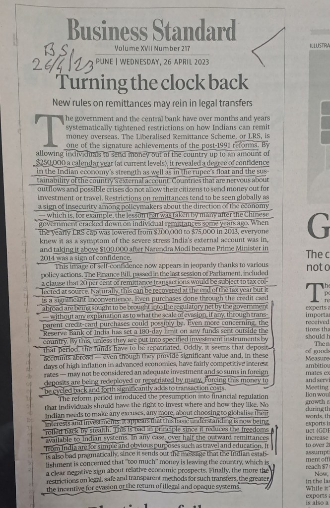 ЁЯЩПЁЯЩПЁЯЩПЁЯЩПЁЯЩПAre the new rules on remittances abroad –counter productive? Courtesy Editorial Business Standard 26.4.23
